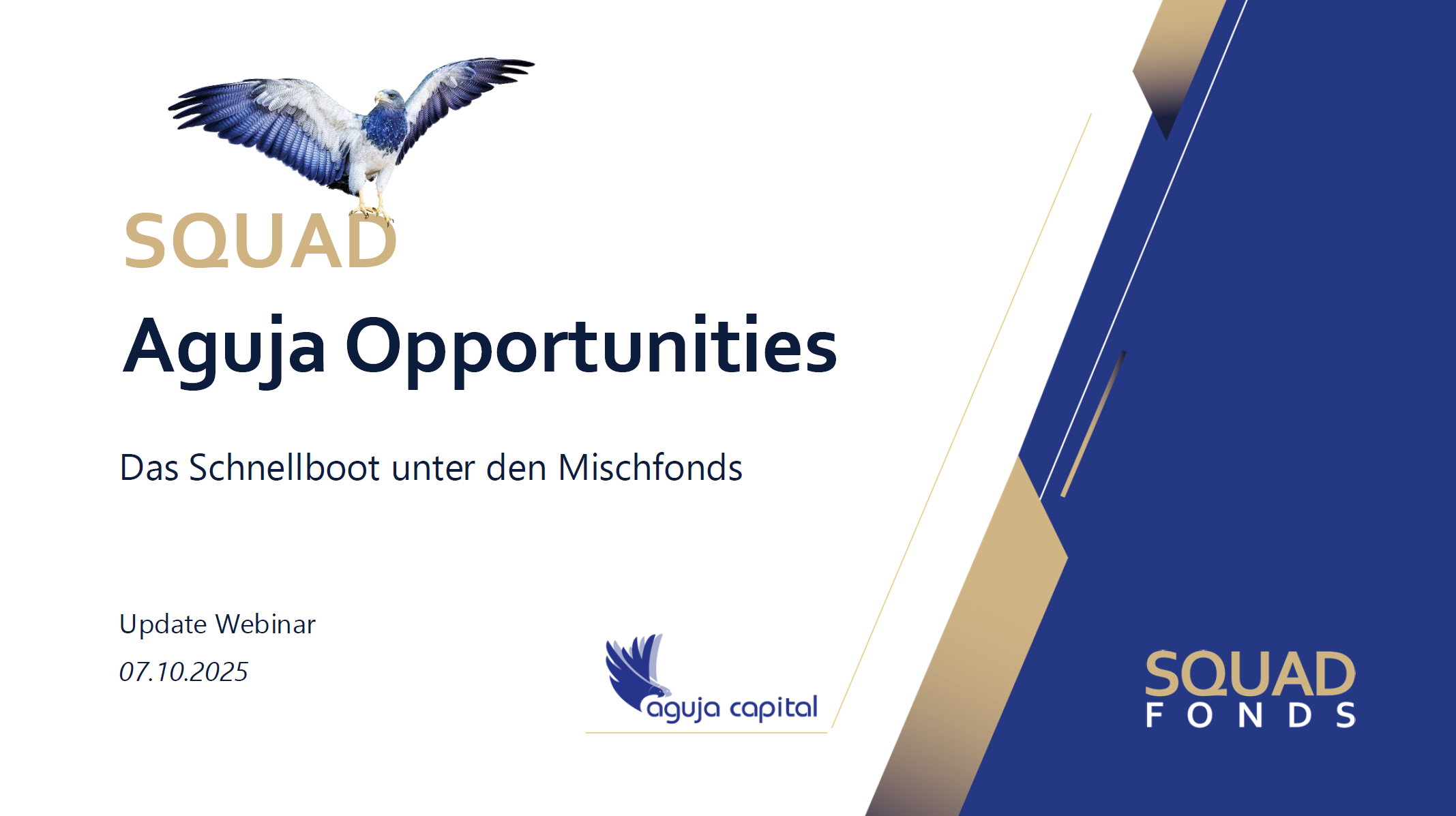 Im Webinar geben die Fondsberater Dimitri Widmann und Fabian Leuchtner Einblicke in den SQUAD Aguja Opportunities Fonds. Der Fonds gilt als das „Schnellboot unter den Mischfonds“ – flexibel, unabhängig von Benchmarks und mit klarem Fokus auf unterbewertete Chancen, insbesondere in Europa. Die Fondsberater erläutern, wie sie das dritte Quartal 2025 bewerten, welche Anpassungen sie in der Fondspositionierung vornehmen und wie der weiterentwickelte Investmentprozess zu einem überzeugenden Rendite-Risiko-Profil beiträgt. Sehen Sie sich die Aufzeichnung jetzt an und erfahren Sie, warum der SQUAD Aguja Opportunities eine interessante Beimischung im aktuellen Marktumfeld darstellt.