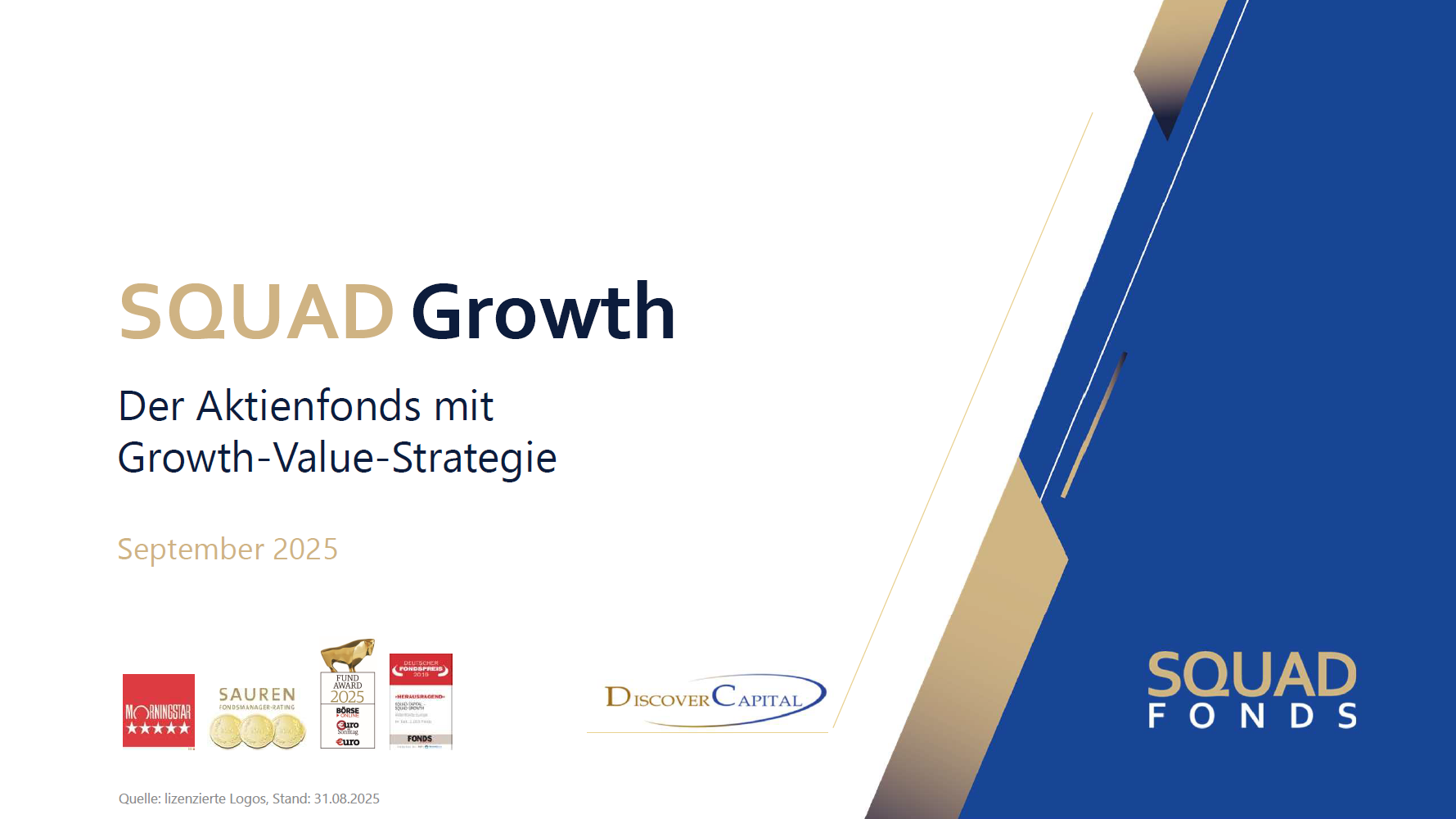 Nach mehreren Jahren im Softclose ist der SQUAD Growth Fonds wieder für Neuanlagen geöffnet. Fondsexperte Tobias Kastenhuber (Leiter des Research-Teams) erläutert im Webinar die Beweggründe für das Reopening, die aktuelle Portfolioausrichtung sowie den strategischen Fokus. Außerdem blickt er auf die Performance der vergangenen Jahre zurück und zeigt, welche Chancen und Herausforderungen europäische Wachstumswerte derzeit bieten.