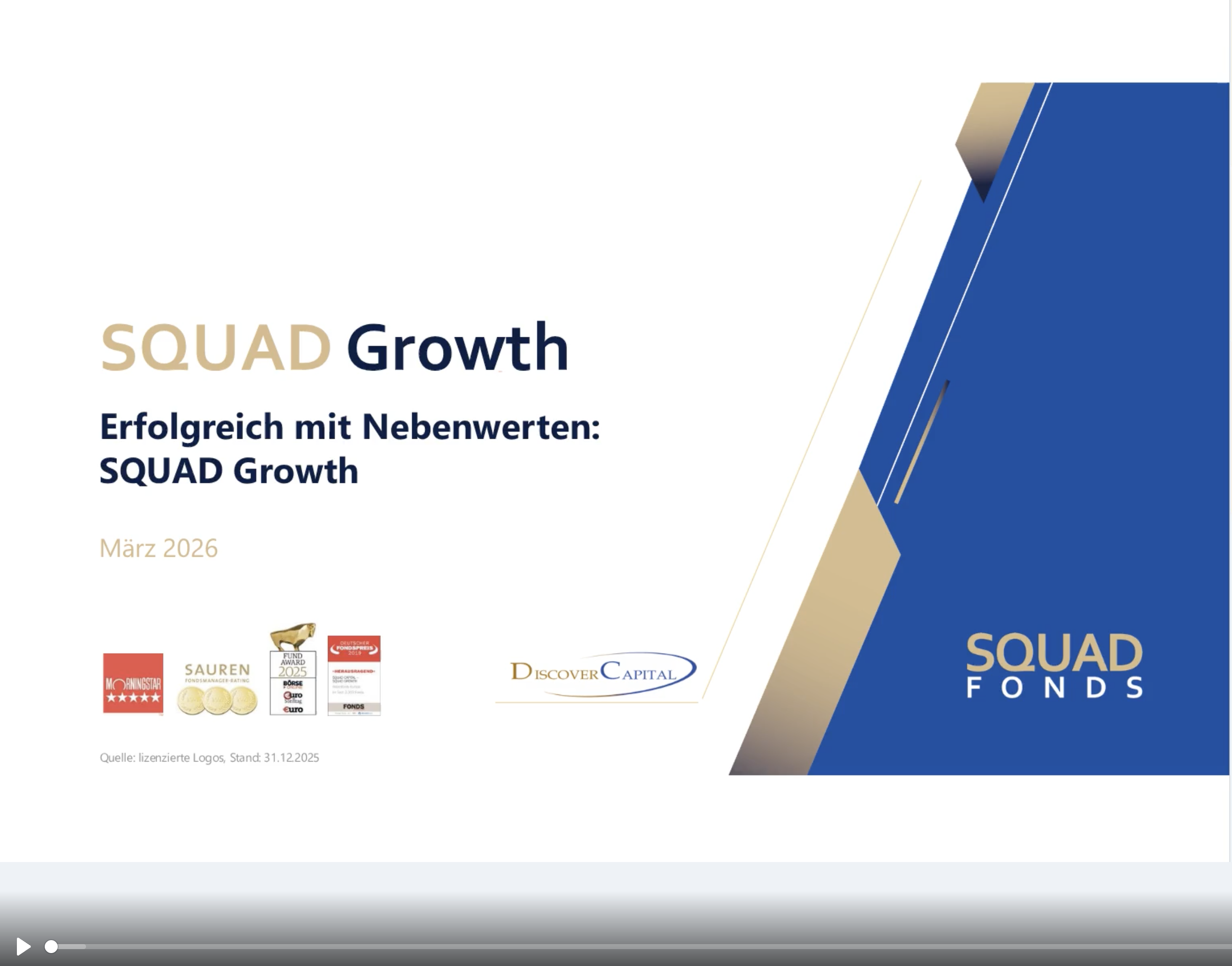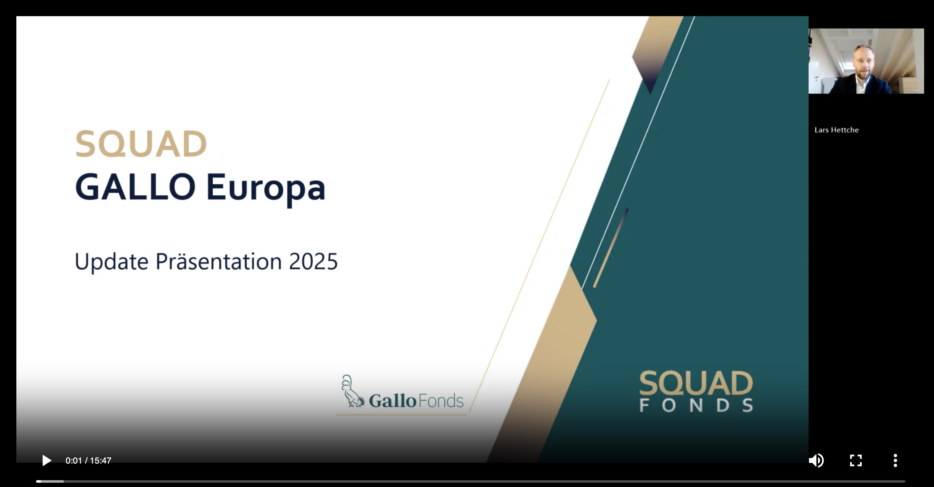 Fondsberater Lars Hettche gibt im Video ein kurzes Update zum SQUAD Gallo Europa. In rund 15 Minuten ordnet er die Entwicklung der vergangenen zwölf Monate ein und wagt anschließend einen nebenwertespezifischen Ausblick auf das laufende Jahr. Das Format richtet sich an Anlegerinnen und Anleger, die mit dem Fonds und der Anlagephilosophie bereits vertraut sind. Im Fokus stehen aktuelle Positionierung und Markteinschätzung – keine allgemeine Strategievorstellung. Bei Fragen oder Gesprächswunsch kommen Sie gerne auf uns zu – wir koordinieren auf Wunsch auch den Austausch mit den Fondsberatern.