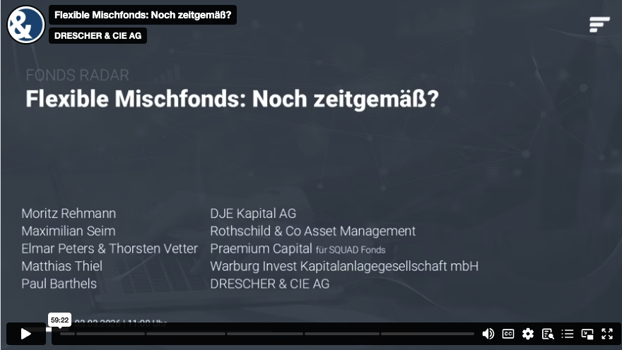 Flexible Mischfonds müssen sich nach der Zinswende im neuen Umfeld bewähren. Erhalten Sie wertvolle Einblicke von vier Kapitalmarktexperten, wann und in welchem Umfang auf Anleihen und Aktien gesetzt werden sollte. Drescher & Cie‘s FondsRadar beleuchtet in diesem Webinar einmal mehr die Mischfonds, die als vielseitige Alleskönner auf dem Prüfstand stehen. Für SQUAD Fonds ist Elmar Peters, einer der beiden Fondsberater des SQUAD Praemium Opportunities, vertreten.