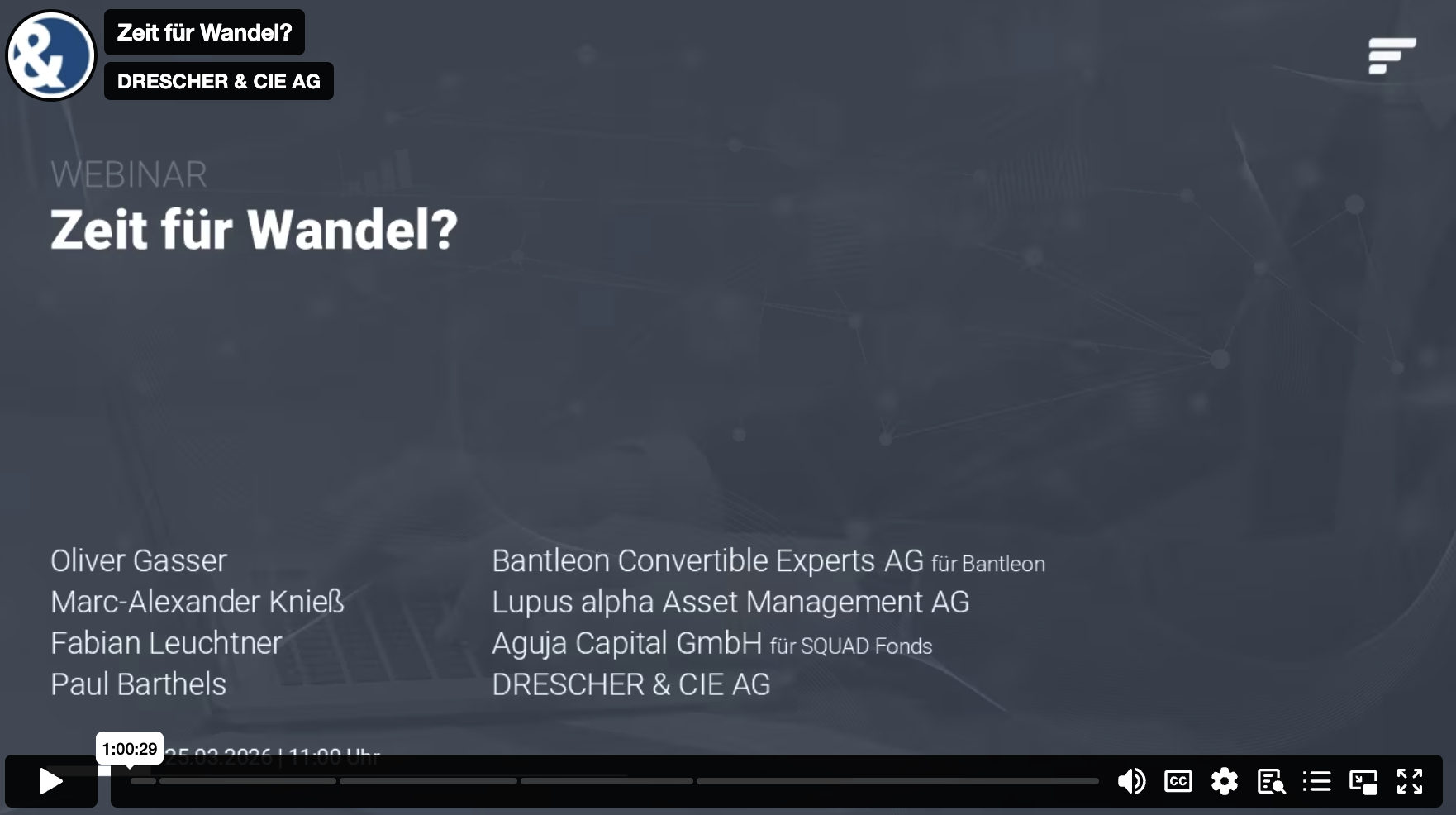 Sehen Sie sich hier die Webinaraufzeichnung von Drescher & Cie an: Fondsberater Stephan Hornung blickt zunächst zurück auf die zweite Jahreshälfte 2025 und analysiert die wesentlichen Gründe für den seitwärts verlaufenden deutschen und europäischen Aktienmarkt. Im Anschluss richtet er den Blick nach vorne und beleuchtet das Marktumfeld für 2026. Dabei geht er der Frage nach, wie der SQUAD Value aktuell positioniert ist und welche Chancen und Herausforderungen sich im kommenden Jahr ergeben könnten. (Mit Klick werden Sie extern weitergeleitet. Für die Datenverarbeitung ist der jeweilige Anbieter verantwortlich.)