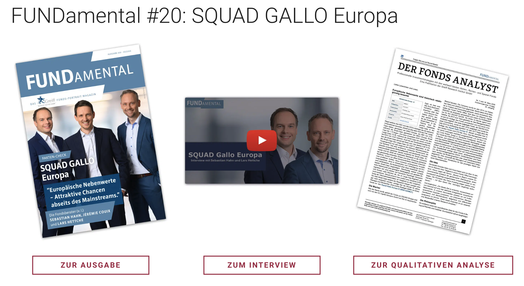 In der 20. Ausgabe des Fondsportrait-Magazins FUNDamental des Greiff Research Instituts steht der SQUAD Gallo Europa R im Fokus. Der Fonds investiert in europäische Nebenwerte und verfolgt einen konsequenten Stock-Picking-Ansatz mit attraktivem Chance-Risiko-Profil. Welche Ideen und Überzeugungen hinter der Strategie stehen und wie die Fondsberater das aktuelle Marktumfeld einschätzen, erfahren Sie im Beitrag – ergänzt durch ein Video-Interview mit Volker Schilling. (Mit Klick werden Sie extern weitergeleitet. Für die Datenverarbeitung ist der jeweilige Anbieter verantwortlich.)