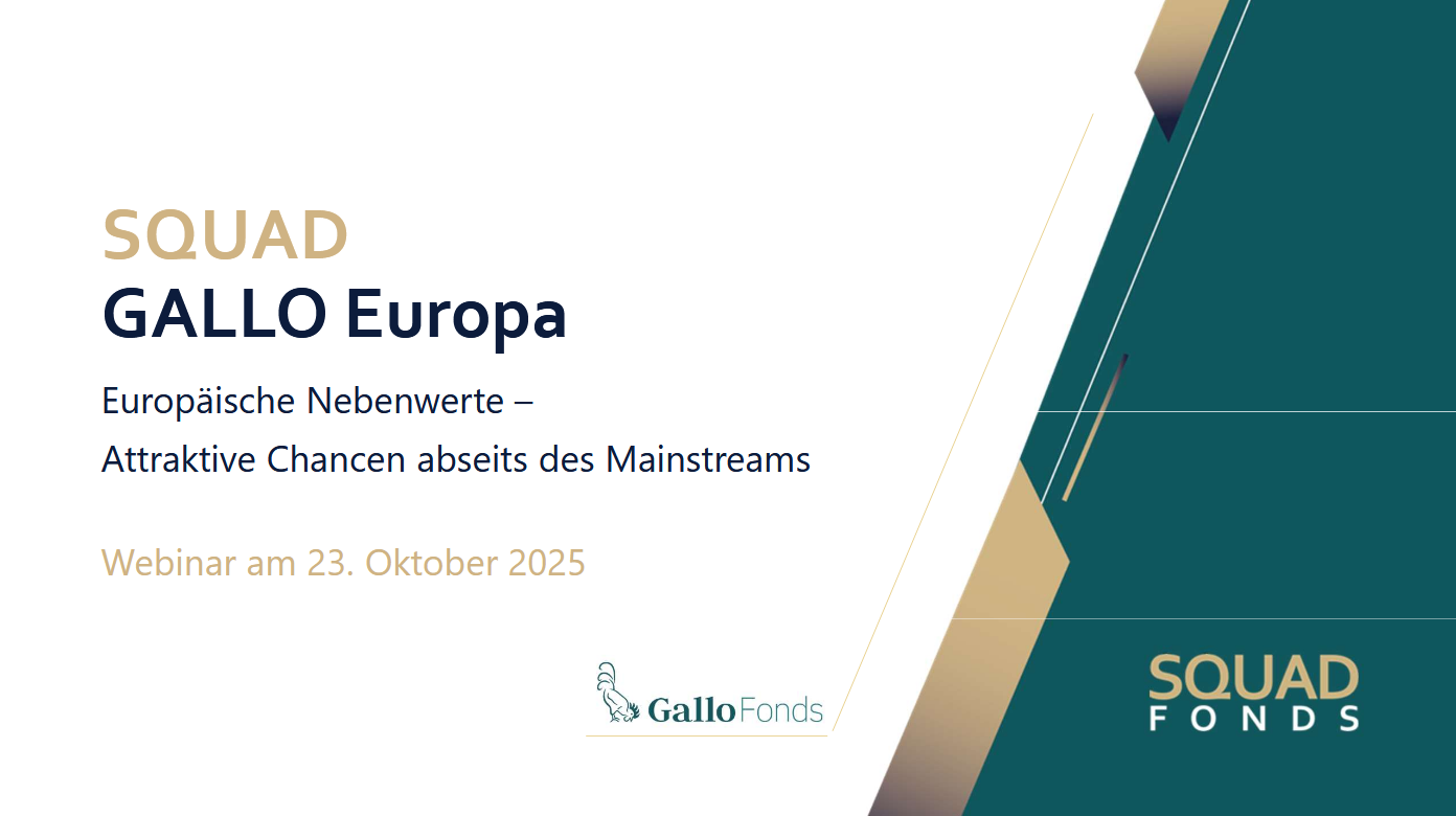 Im Webinar erläutert Lars Hettche, Fondsberater des SQUAD Gallo Europa, warum der Fonds derzeit zu den interessanten Optionen im Bereich europäischer Aktien zählt. Er gibt Einblicke in die aktuelle Fondspositionierung und zeigt, wie der aktive Investmentansatz des Fonds dazu beiträgt, unterbewertete Qualitätsunternehmen – sogenannte Hidden Champions – in Europa gezielt zu identifizieren. Sehen Sie sich die Aufzeichnung jetzt an und erfahren Sie, welche Chancen sich derzeit in europäischen Aktienmärkten bieten und wie der SQUAD Gallo Europa diese gezielt nutzt.